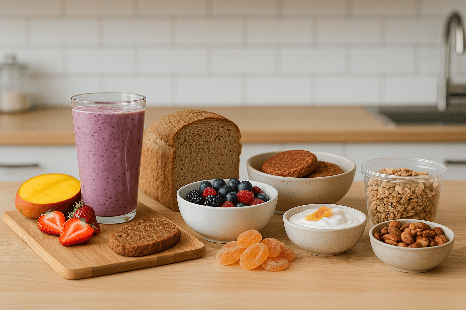 첨가물이 적은 천연 곡물빵, 당 함량이 낮은 무가당 시리얼을 선택하고, 단맛은 과일이나 견과류로 보완하세요.