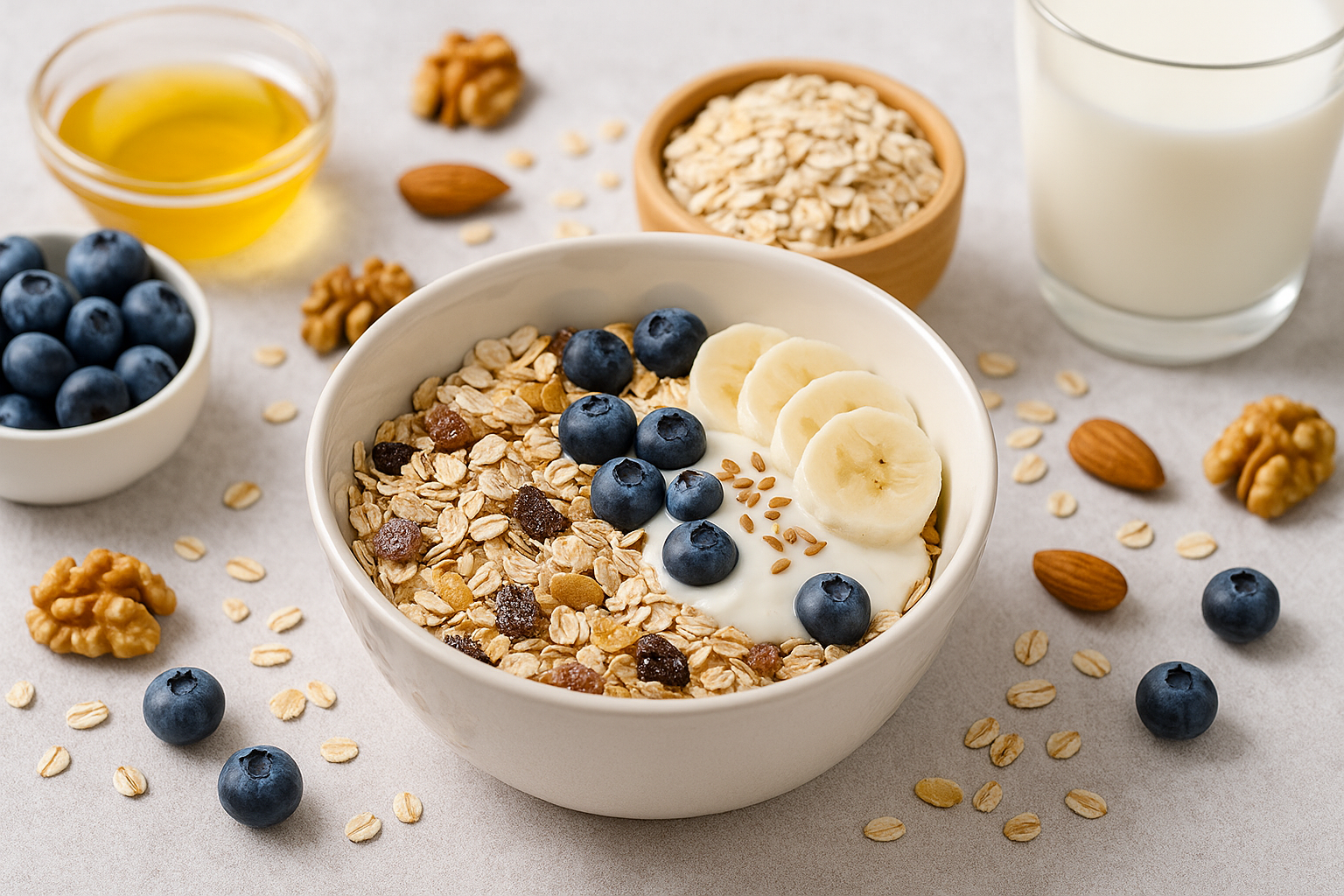 뮤즐리는 단순히 아침을 해결하는 식사가 아닌, 장 건강, 혈당 관리, 면역력 강화, 체중 조절까지 동시에 챙길 수 있는 건강한 습관입니다.