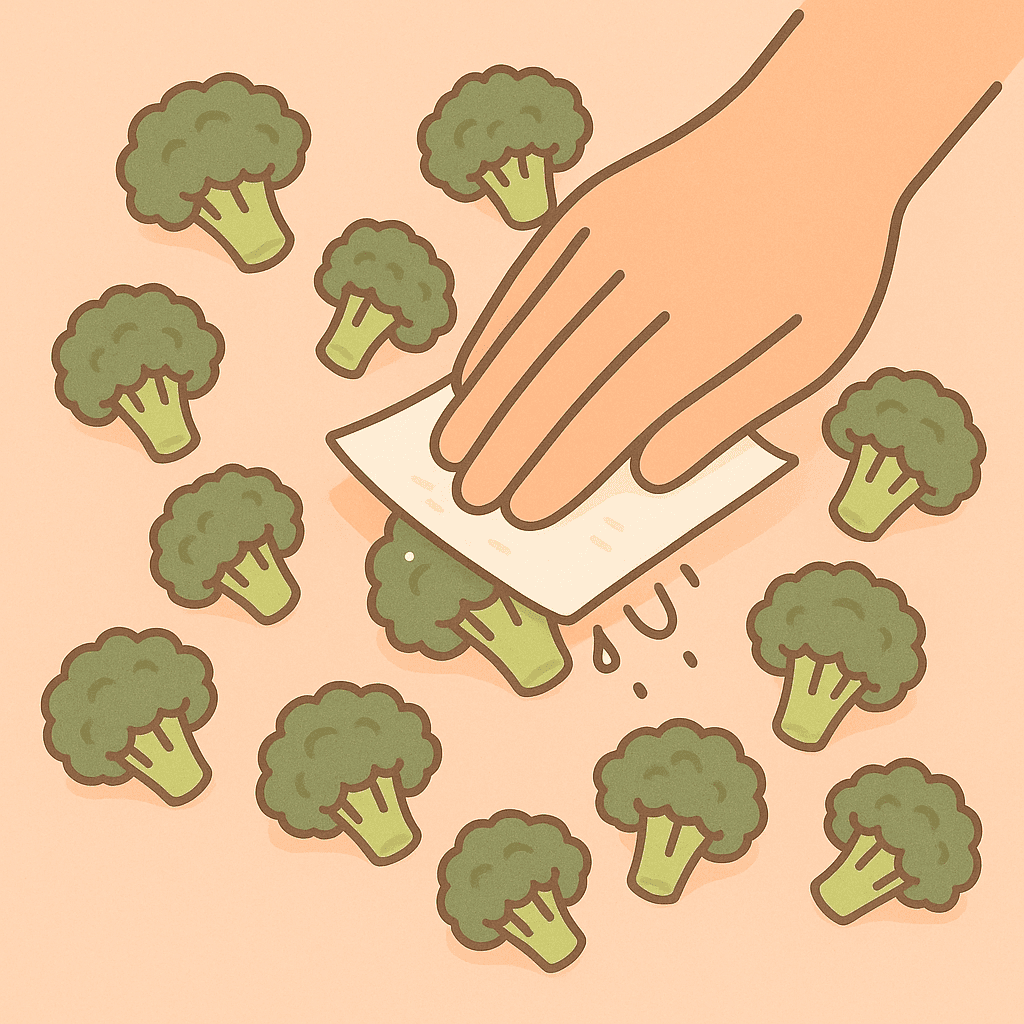 헹군 브로콜리는 키친타월로 톡톡 두드려 물기를 완전히 제거합니다.